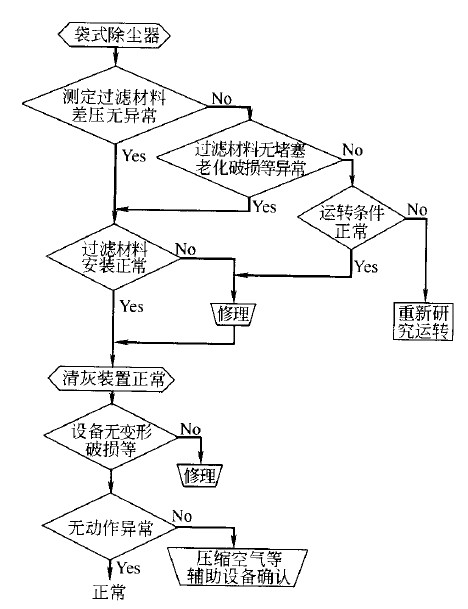 布袋除塵器的維護(hù)管理對確保除塵器的穩(wěn)定運(yùn)行,達(dá)到預(yù)期的除塵效果具有重要意義。布袋除塵器檢修流程如圖所示。