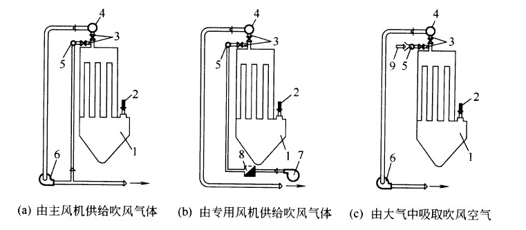 5- 吹風(fēng)氣體總管; 6- 主風(fēng)機(jī); 7- 吹風(fēng)機(jī); 8- 加熱器; 9- 空氣吸入口