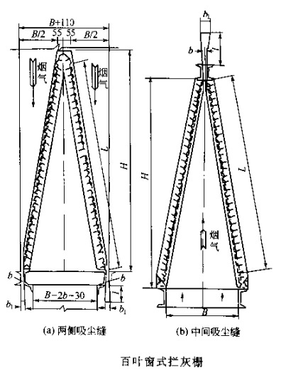 對于所有型式的攔灰柵,其允許的葉板數_多為75。在此情況下,煙氣進氣口寬度 B=1350 (1425)mm。對于大容量的除塵器,當計算所得的 B>1350 (1425)mm 時,_并列裝置幾個攔灰柵。