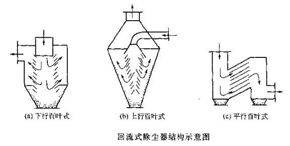 (2) 回流式除塵器結構形式 該除塵器特點是把進氣流用擋板分割為小股氣流。為使任意一股氣流都有同樣的較小回轉半徑及較大回轉角,可以采用各種擋板結構,_典型的便如圖所示的百葉擋板。