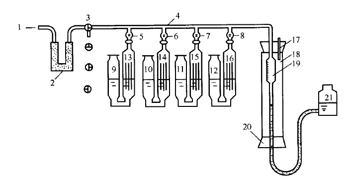 1、進(jìn)氣管;2、干燥器;3、三通旋塞;4、梳形管;5、6、7、8、旋塞;9、10、11、12、緩沖瓶; 13、14、15、16、吸收瓶;17、溫度計(jì);18、水套管;19、量氣管;20、膠塞;、21、水準(zhǔn)瓶