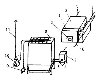 5-電護(hù);6-風(fēng)管;7--重力除塵器;8-布級(jí)除塵 器;9一反吹風(fēng)機(jī);10一引風(fēng)機(jī);11-排氣筒