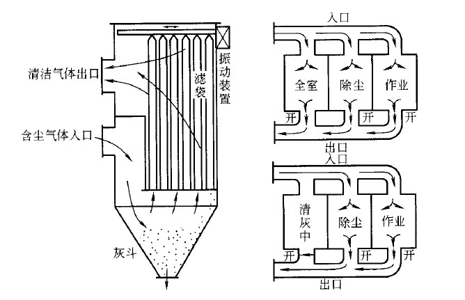 振動(dòng)清灰布袋除塵器是利用機(jī)械裝置振打或搖動(dòng)懸吊 除塵濾袋 的框架,使除塵濾袋產(chǎn)生振動(dòng)而清落積灰,圓袋多在頂部施加振動(dòng),使之產(chǎn)生垂直的或水平的振動(dòng),或者垂直與水平兩個(gè)方向同時(shí)振動(dòng),施加振動(dòng)的部位也有在濾袋的中間位置的。由于清灰時(shí)粉塵要揚(yáng)起,所以振動(dòng)清灰常采用分室工作制,即將整個(gè) 布袋除塵器 分隔成若于個(gè)袋室,順次地逐室進(jìn)行清灰,可保持布袋除塵器的連續(xù)運(yùn)轉(zhuǎn)。進(jìn)行清灰的袋室,利用閥門自動(dòng)地將風(fēng)流切斷,不讓含塵空氣進(jìn)入。以頂部為主的振動(dòng)清灰,每分鐘振動(dòng)可達(dá)數(shù)百次,使粉塵脫落入灰斗中。振動(dòng)清灰方式袋式除塵器如圖所示。